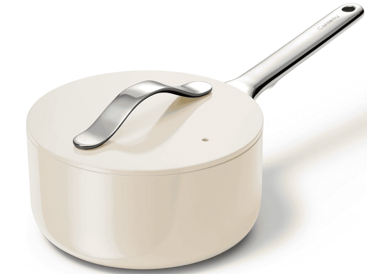 Caraway 3 qt saucepan with lid in cream. I use this sauce pan mostly for making oatmeal or rice! It's truly nonstick and it's non-toxic cookware. Plus, it looks so nice you can leave it on your stovetop if you don't have storage space in your cabinets!